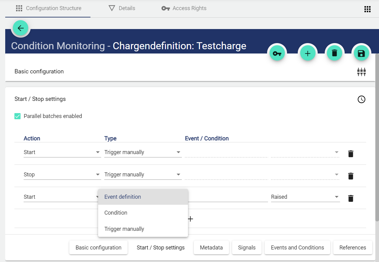 In this setting it must be selected how the batch start and the batch stop are defined. There is a possibility to allow parallel batches. In this case, several batches can be started simultaneously with one batch definition.