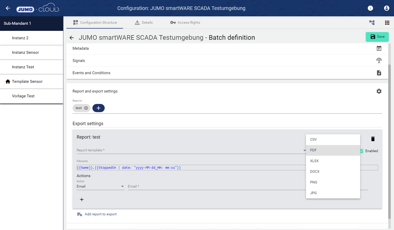 By adding one or more reports, the batch can be viewed in a customized design depending on the report. In addition, it is possible to send batch reports automatically event-based in different formats by mail or to save them in a directory.