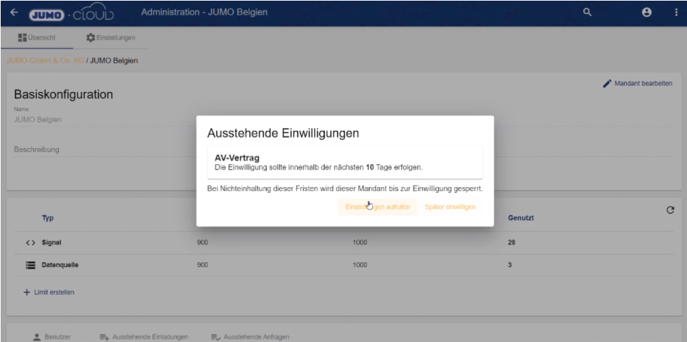 If a person now goes to the corresponding Tenant (here JUMO Belgium) in which a contract was previously activated, the person receives this message with a request for acceptance. If the person accepts: The OPC applies to all persons associated with this Tenant.