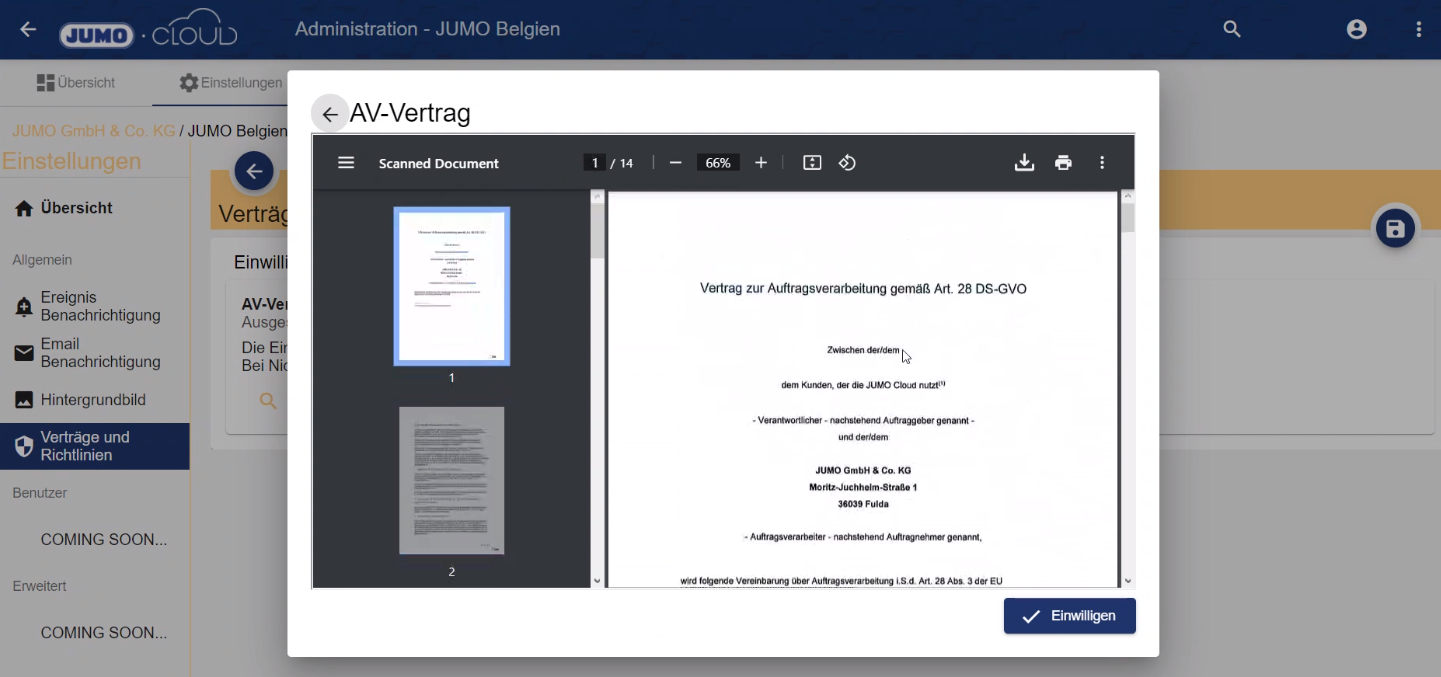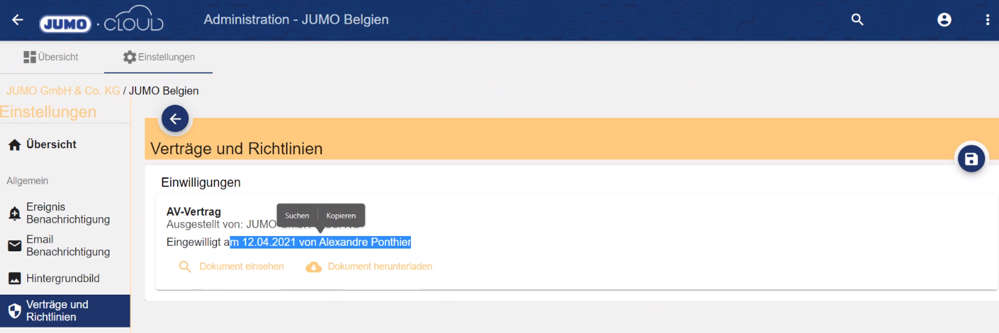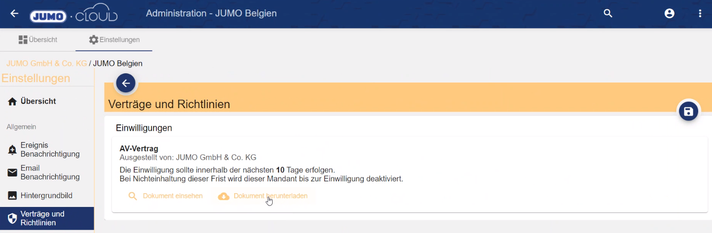 This function is used to agree and sign contracts or directives with Tenants. In general, this setting option can be used to store any contract document with the Tenant or customer. In JUMO, this function is primarily used to transparently record data protection agreements with customers of the JUMO Cloud in an order processing contract in accordance with the GDPR.