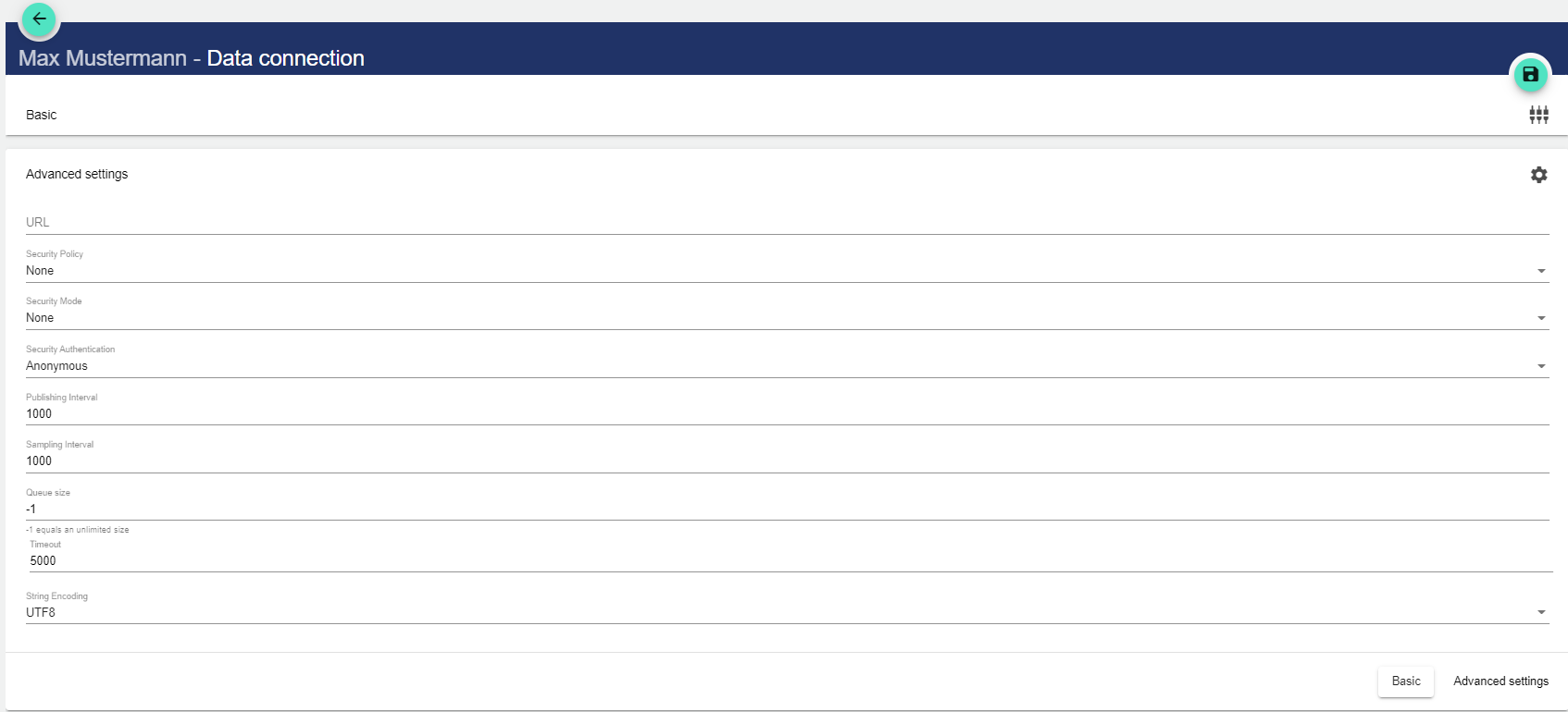 Save via the disk icon in the upper right corner. When using a new data connection, default values are automatically entered.