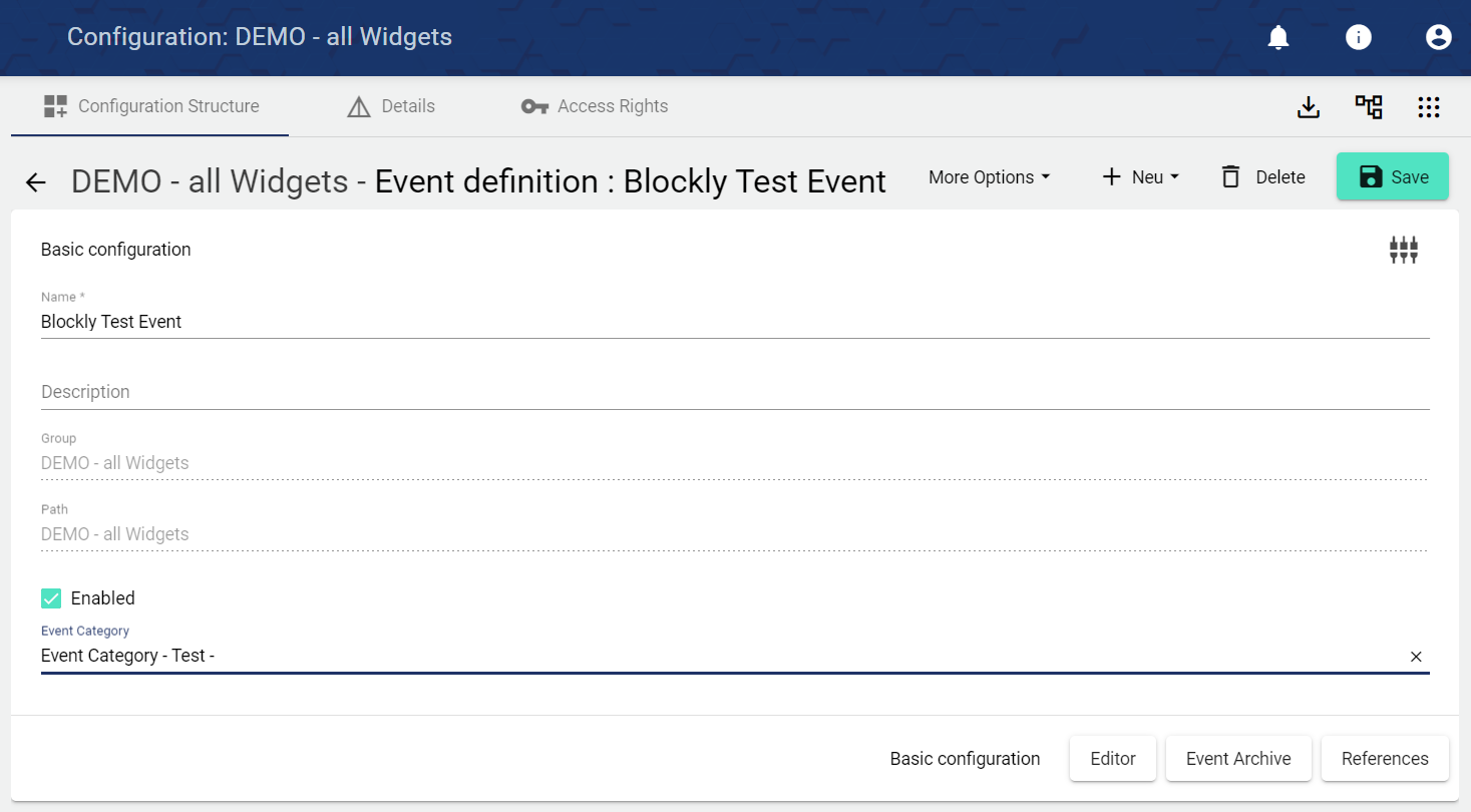 The event editor is used as the basis for creating an event. With the help of various operators and parameters, the triggering of the event can be built together via drag and drop.