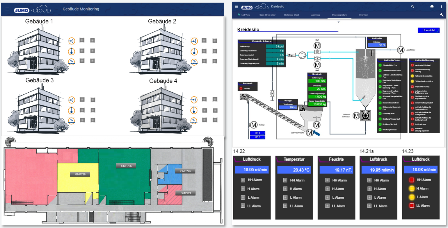 With process images, it is possible to better represent and also to animate your own objects, plants, buildings, or even processes in the JUMO application. In addition, current actual or target values, a batch number or any other information can also be embedded in these images. Signals can be used to either display this information or to control an animation (e.g. door open → digital input set to 1 → plant is displayed in the JUMO application with door open).