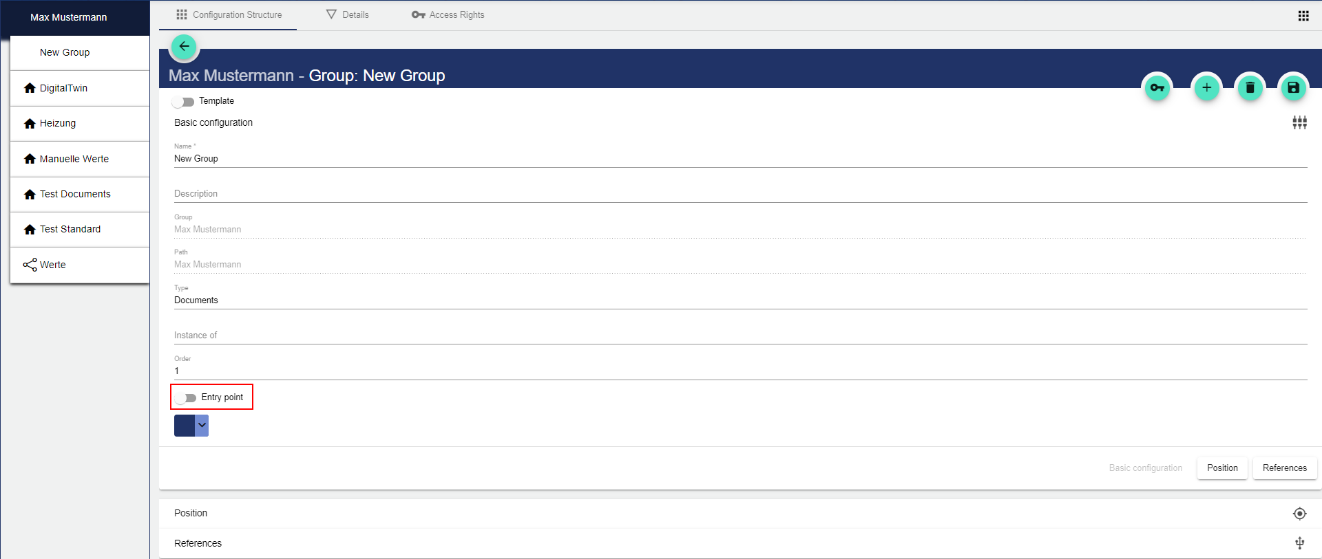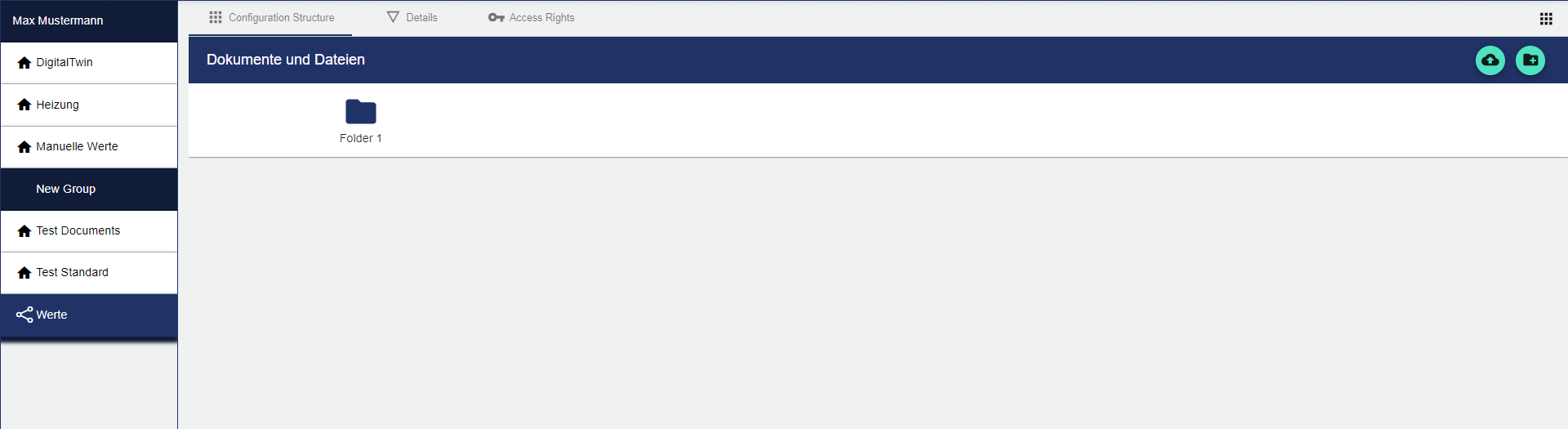 Using "DigitalTwin", a Group is created that adopts the combined settings of both "Standard" and "Documents". The Group is configured via the configuration structure. Documents can be uploaded via the "Documents" button.