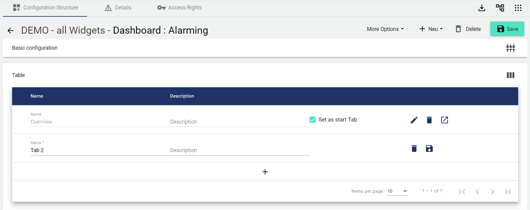 Once again via the configuration structure, select the Dashboard and add another one (see also: Dashboard Setup). In the Basic Configuration, assign the name and add as many tabs as you want via the "Panel" area → Save.