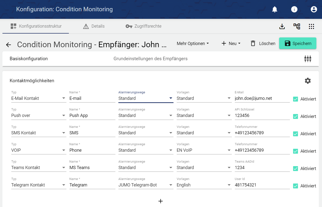 The “standard” always includes the default alarm provider (messagelines) stored by JUMO with an alarm template in German.