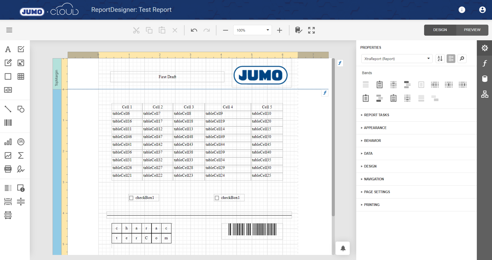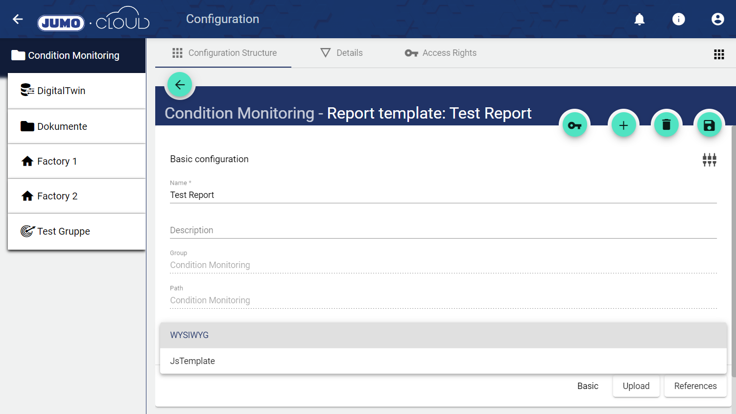 Report templates can be created in "WYSIWYG" (What you see is what you get) format without programming knowledge. For this purpose, a browser-based "Report Designer" was developed, which can be called from the platform. With the "JsTemplate" it is possible to use individually programmed JavaScript templates.