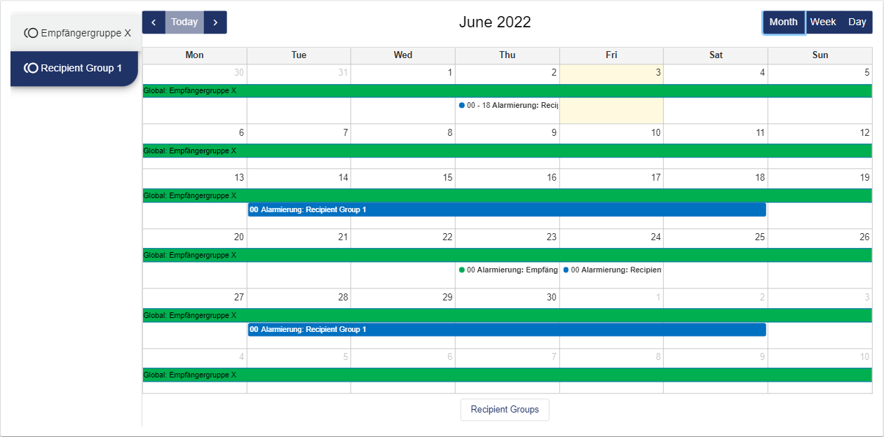 With Alarm Scheduling, you can assign an Alarm Schedule previously created in the configuration to a specific Recipient Group for specific time periods. The calendar view can be displayed in the widget as month, week or day. Here you can view past schedules and plan future ones. A selected Recipient Group can be regularly alerted to specific events using alarm scheduling. As soon as the Event occurs, the group is alerted. By default, the "Global Recipient Group" is selected. The " Global Recipient Group" is continuously alerted should the event occur.