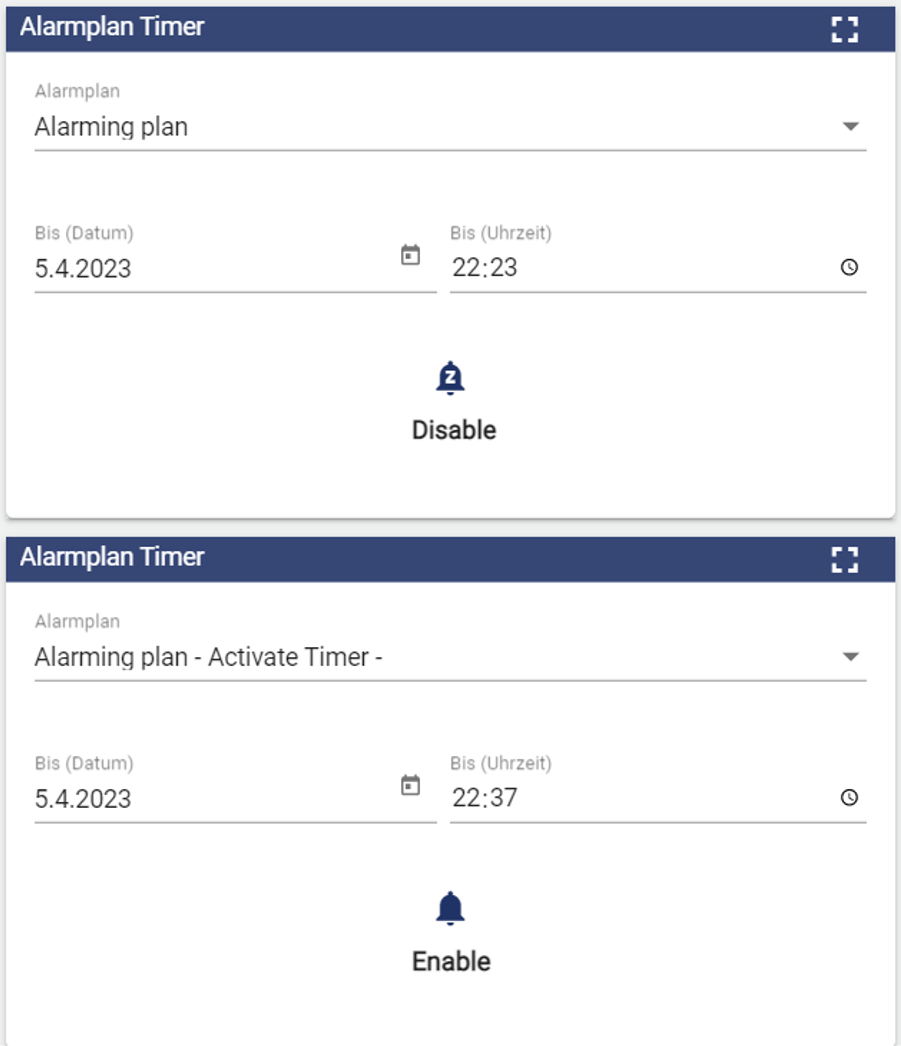 The widget: “Alarming plan timer” can be used to activate or deactivate alarming plans up to a certain date. If the alarming plan is disabled, no alarm will be sent to the recipient groups.