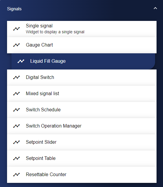 The widget displays the data of the selected analog signal as a wave. The fill level changes depending on the value and the set limits. When configuring the fill level measuring instrument, you have many options and a preview to visualize the changes in real time.