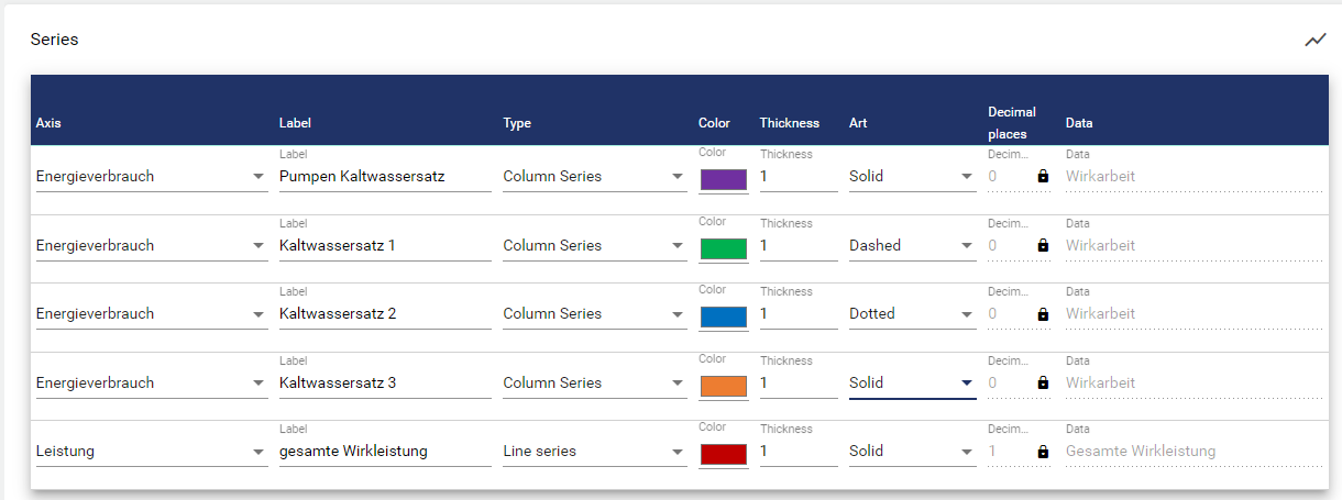 A series is automatically created for all selected data points. A suitable axis must be assigned for each signal. You can also specify the label, line type and color, as well as the line thickness and the decimal places in the chart.