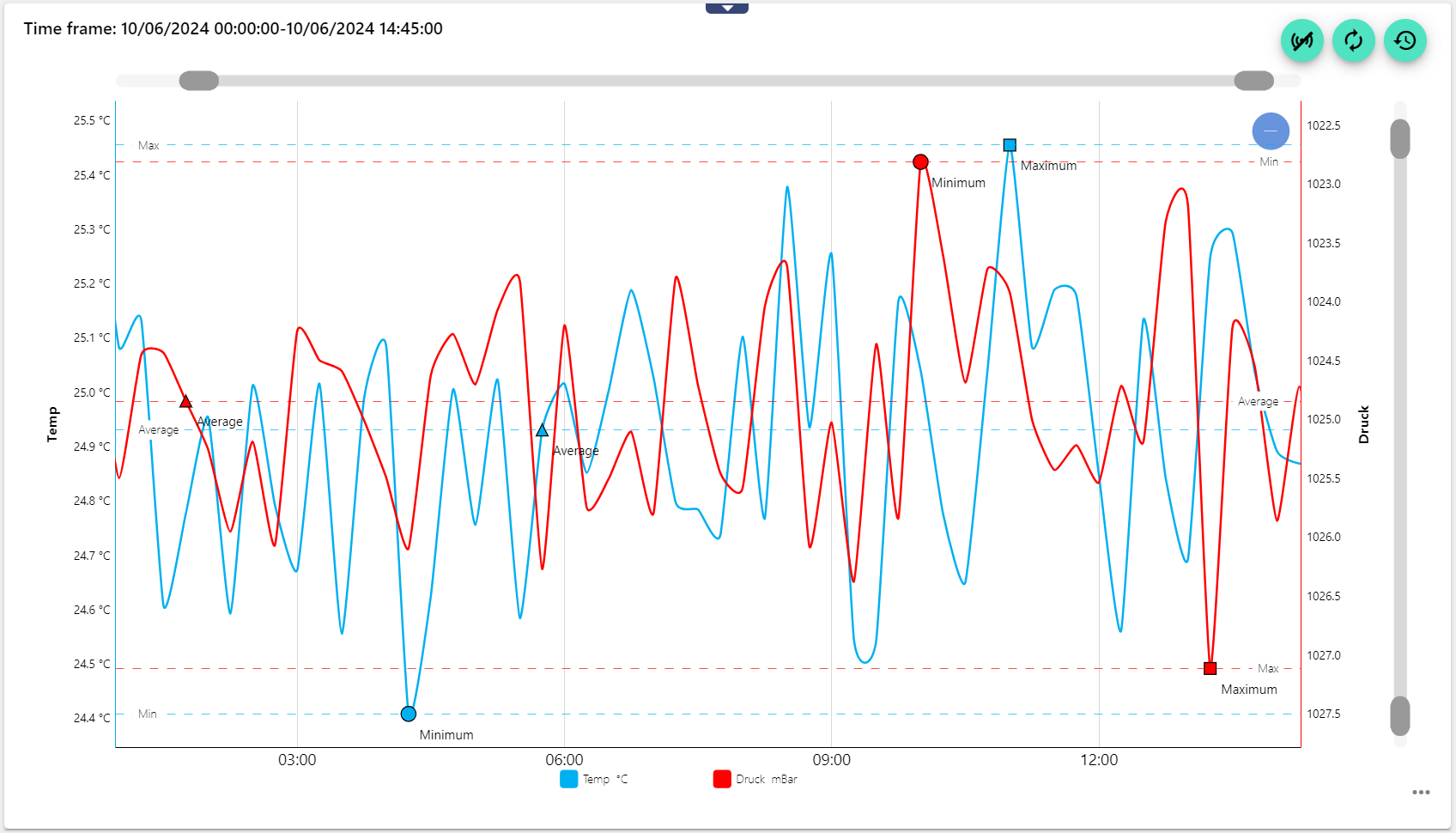 The series range can be extended to the right using a horizontal scrollbar. Corresponding selections for min, max and average values (axis ranges, auxiliary lines, data points) can be defined for each signal here.