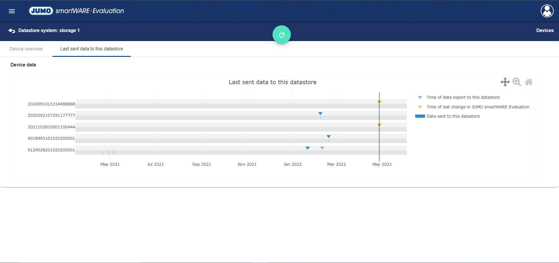 The last 5 data exports per device are shown under the tab Last data sent to this Datastore.