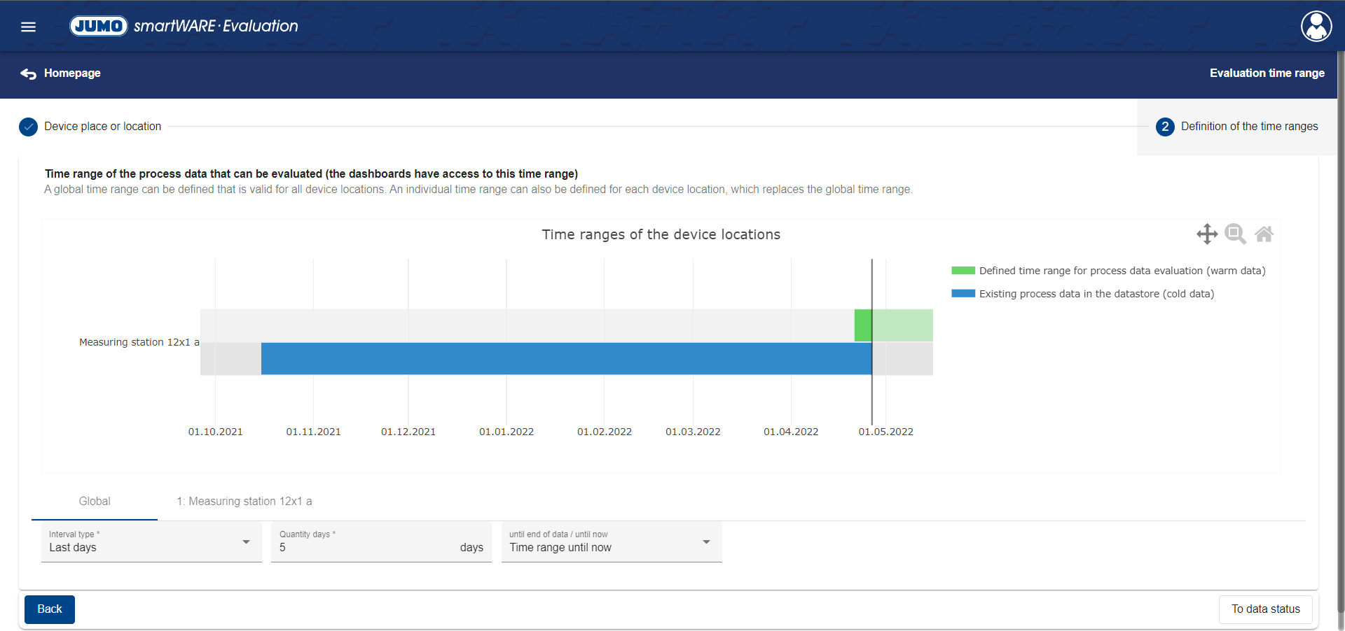 The time range that can be accessed for the existing data of a connected device Dashboards is defined in the menu item Evaluation Time Range. Cold Data is "converted" into Warm Data here.