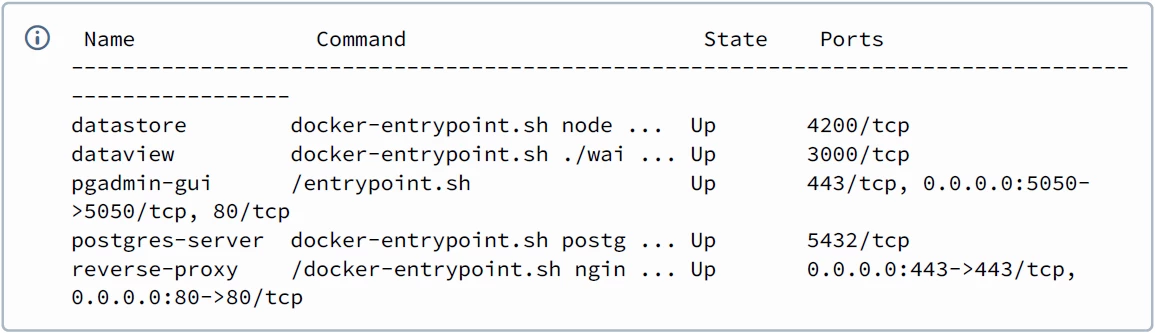 If all services show the state Up, the services are running. You can now open the start page in the browser by clicking http://IP or https://IP. Where IP stands for the IPv4 address of the W10 PC on which the services were started. However, you can also use the hostname of the computer instead of the IP address or http://localhost, if the browser was started on the same computer.