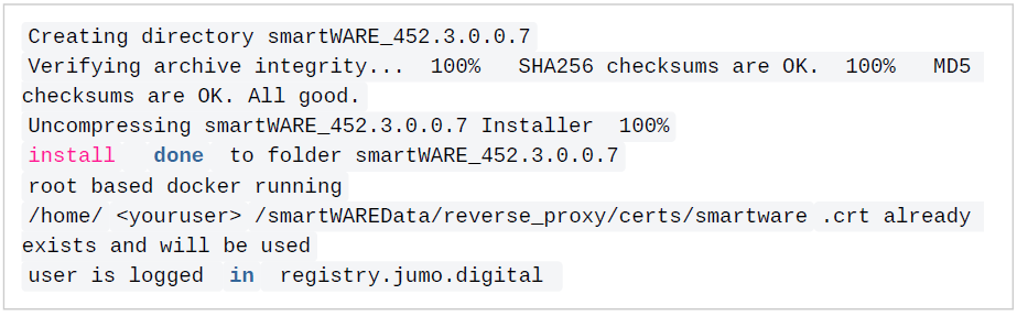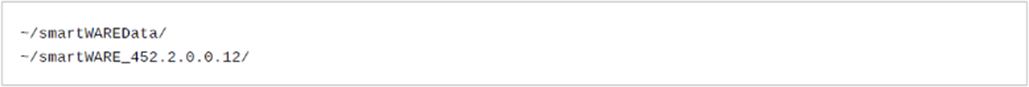 The directory ~/smartWAREData/ contains all persistent data of the application. This is where all the data that needs to be retained is stored, even after a software update, such as the measured values transferred from the Jupiter devices, user settings such as dashboards or device location information. For this reason, this directory is also specially protected and sudo permissions are required for access. The directory ~/smartWARE_452.2.0.12/ contains all scripts that are needed to run the application. e.g. start and stop script to start and stop the Docker services. In this directory, individual settings can also be configured and saved in a .env file. More about this in the chapter "Basic configuration".
