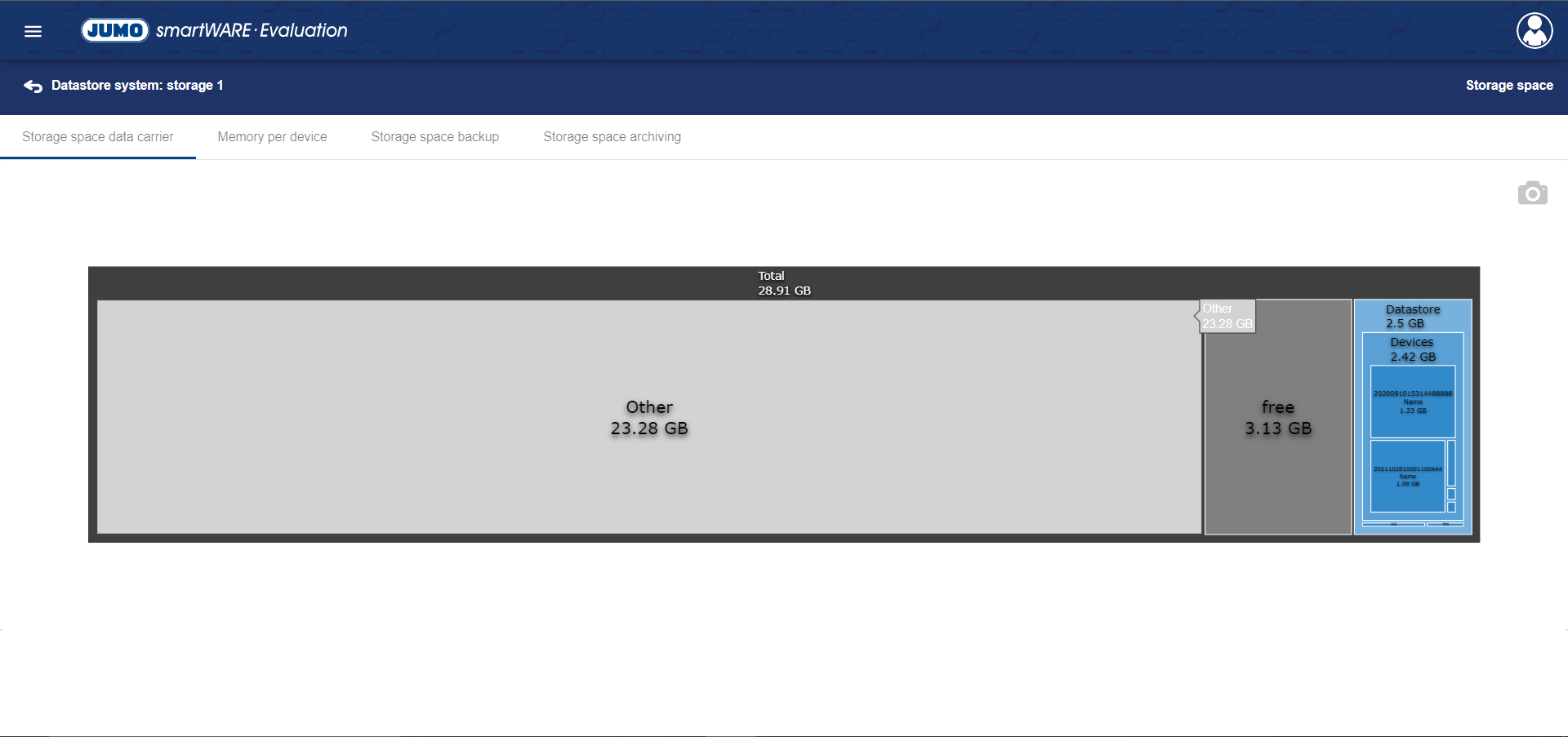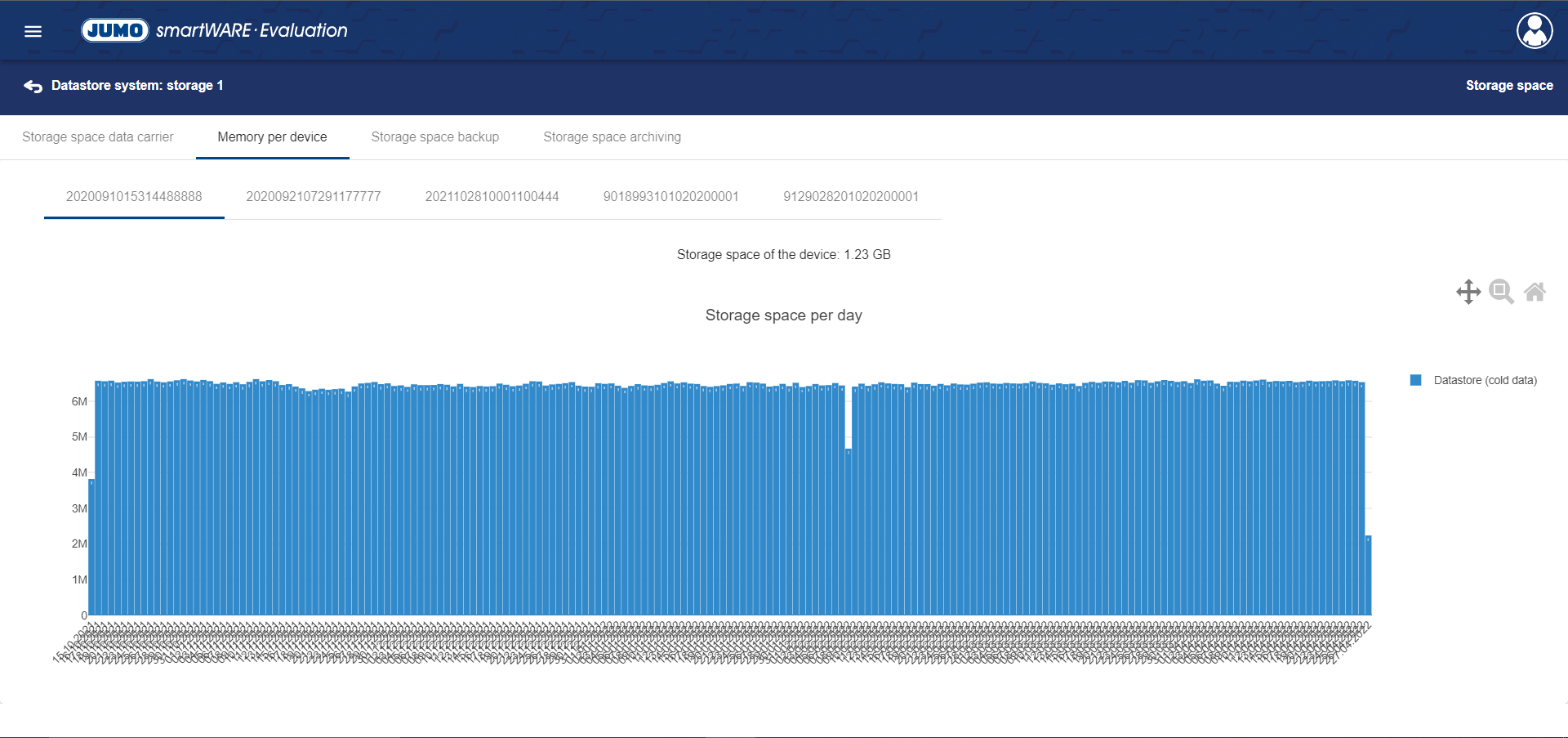 In this tab you can see the memory consumption per device. The device can be selected in the menu above and is named according to the fabrication number.