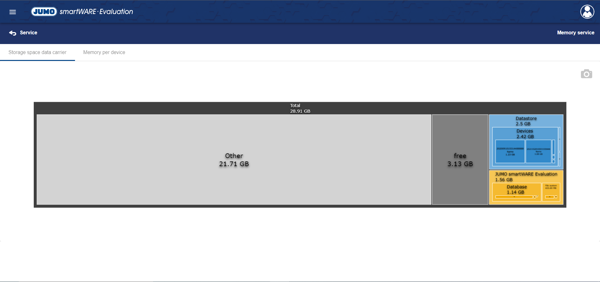 In this tab you can see the memory consumption per device. The device can be selected in the menu above and is named according to the fabrication number.