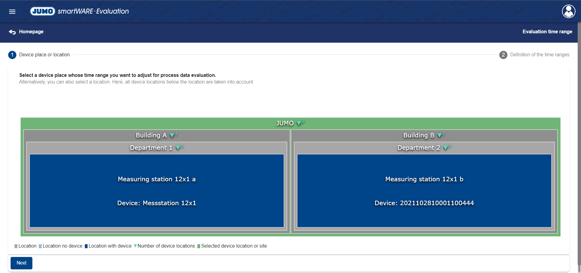 First, a device must be selected. For this purpose, either a device location or a higher-level site can be selected directly. Should a site be selected, the evaluation time range can be determined for all devices below it.