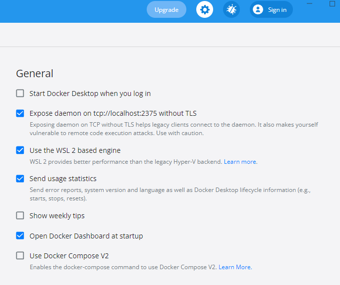 IMPORTANT!! "Use Docker Compose V2" in the General menu item must NOT be enabled.