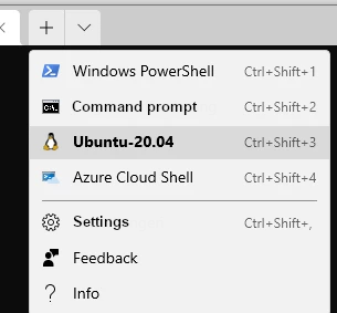 The software must be installed in the Linux files system of Windows (WSL2)! Please note that after starting the terminal program a "Windows PowerShell" opens automatically. However, we need a Linux terminal for installation. For this reason, you now also open a Linux terminal (Ubuntu-20.04):