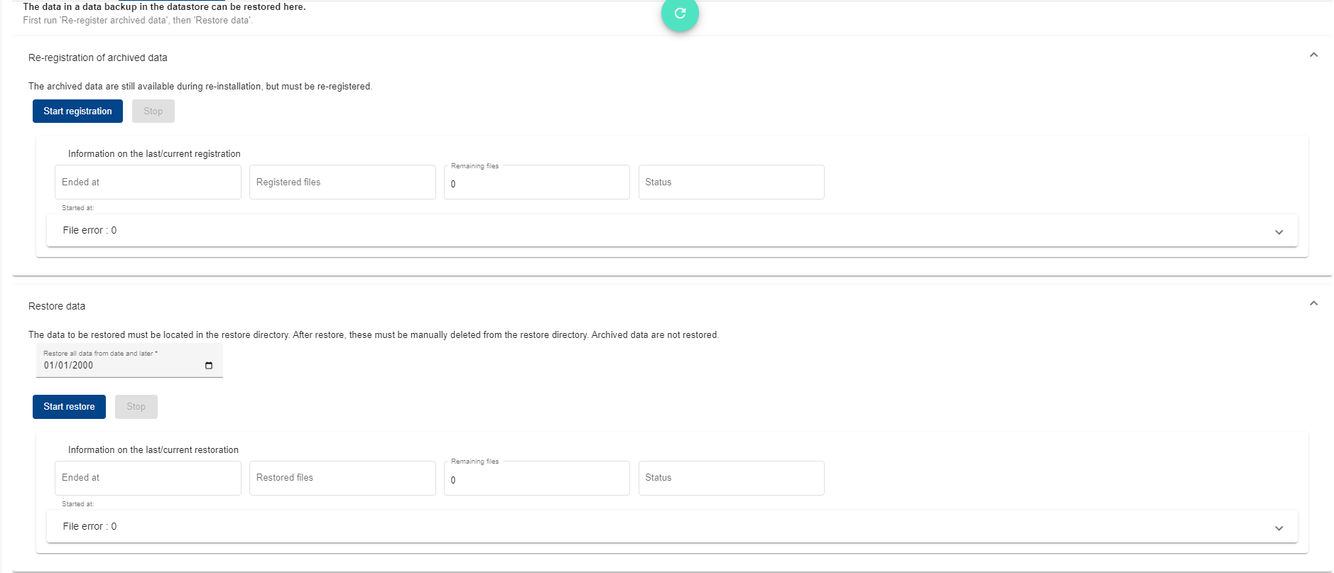 Here, data from a data backup can be read into the system. The data to be restored must be located in the restore directory (see above). After restoration, this data must be deleted manually from the restore directory. Archived data is not restored.