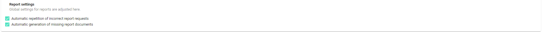Enabling the checkboxes enables the automatic repetition of failed report requests, as well as the automatic generation of missing report documents.