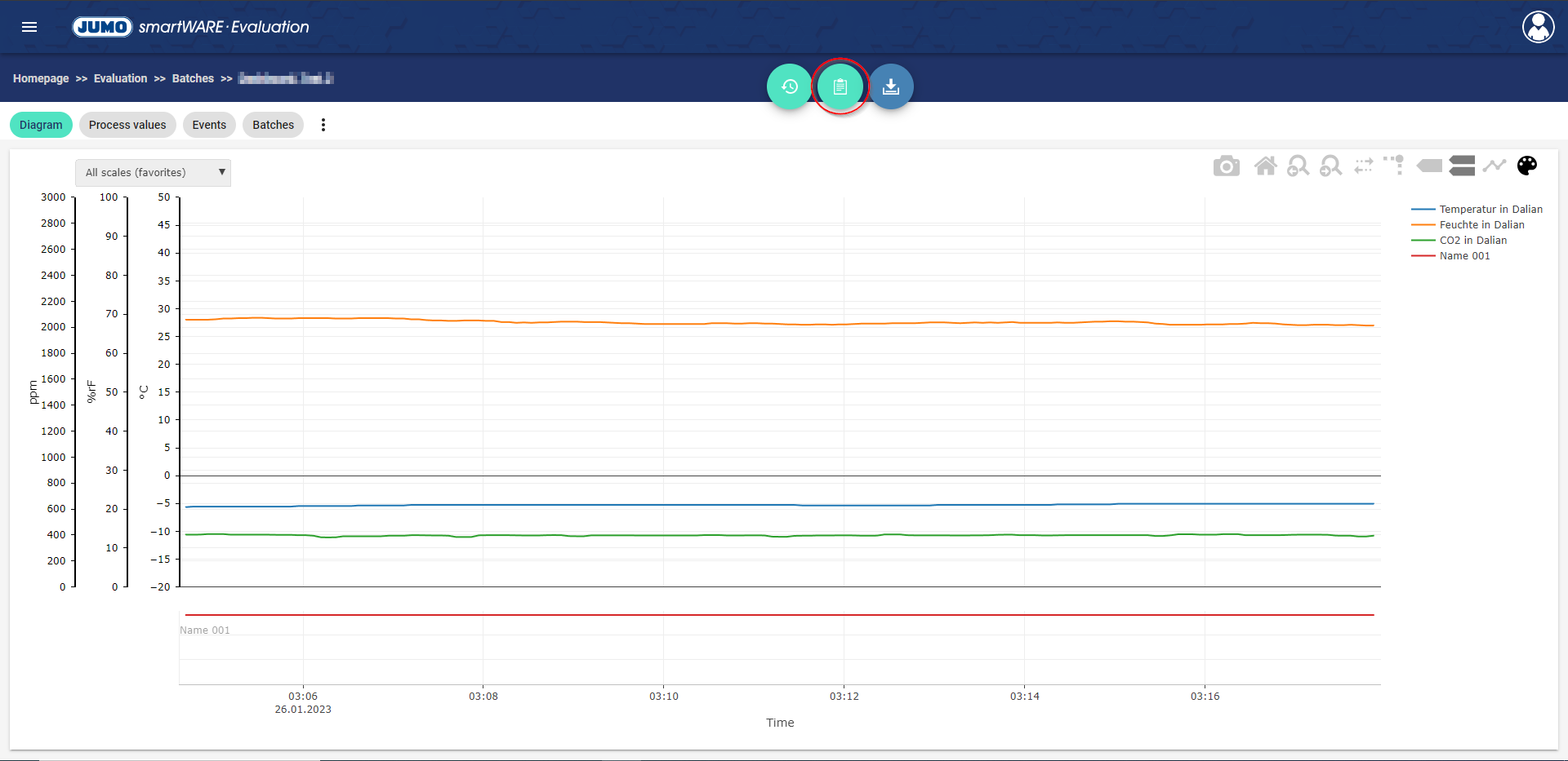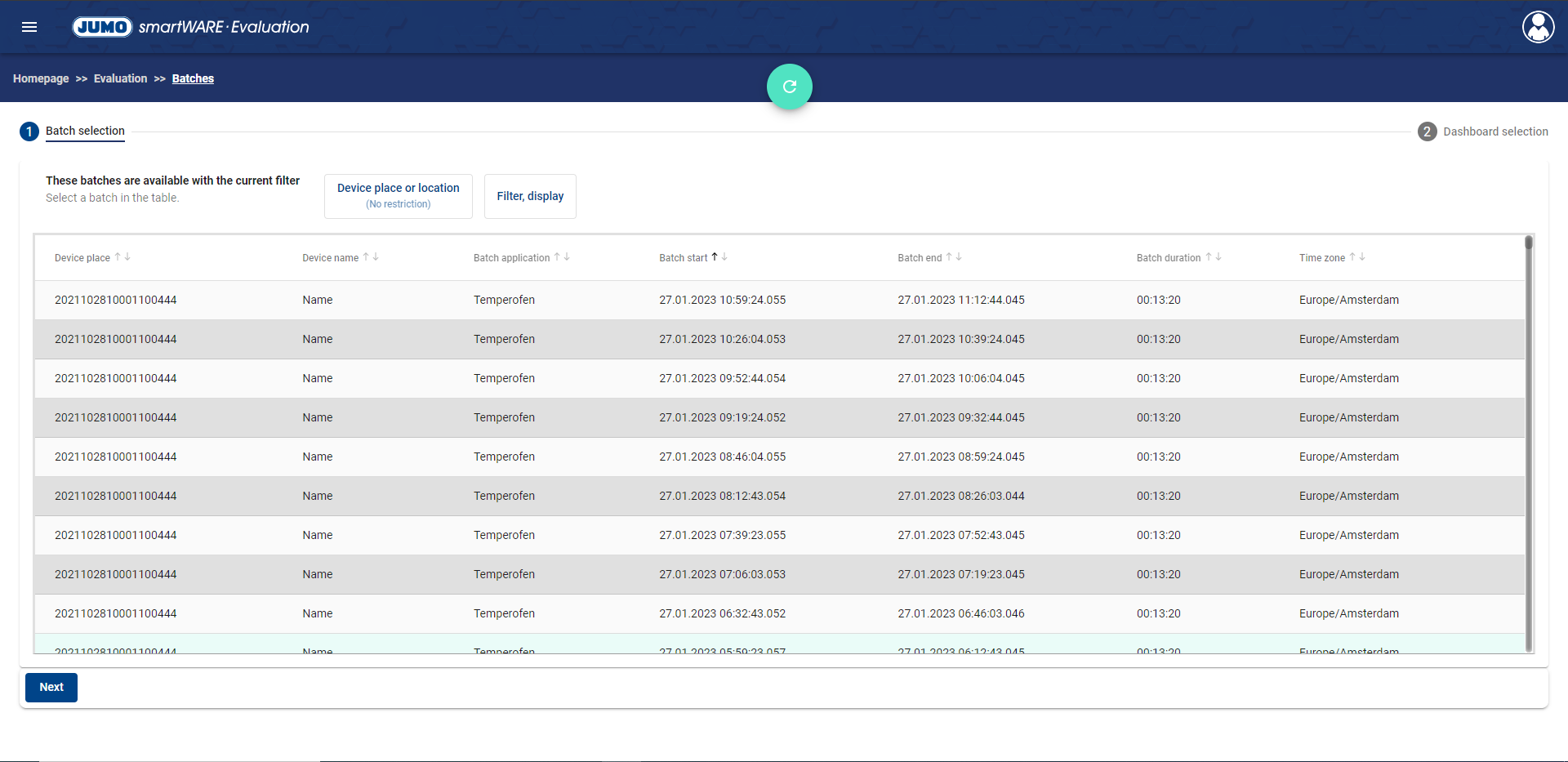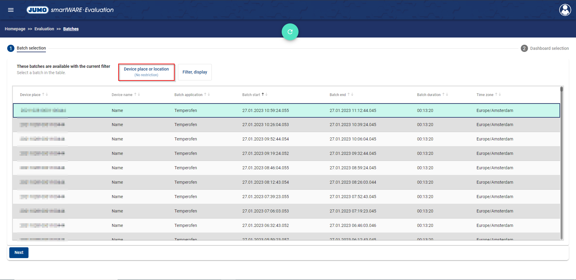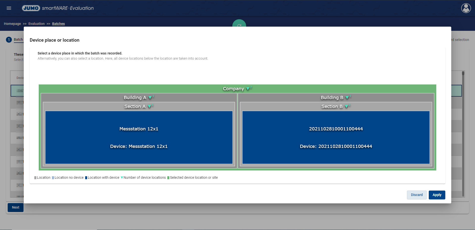 To be able to evaluate a batch, first of all a device location or a site can be selected in the tree structure created for the company. If the user selects a location, batches of all subordinate device locations are displayed in step 3 Batch selection.