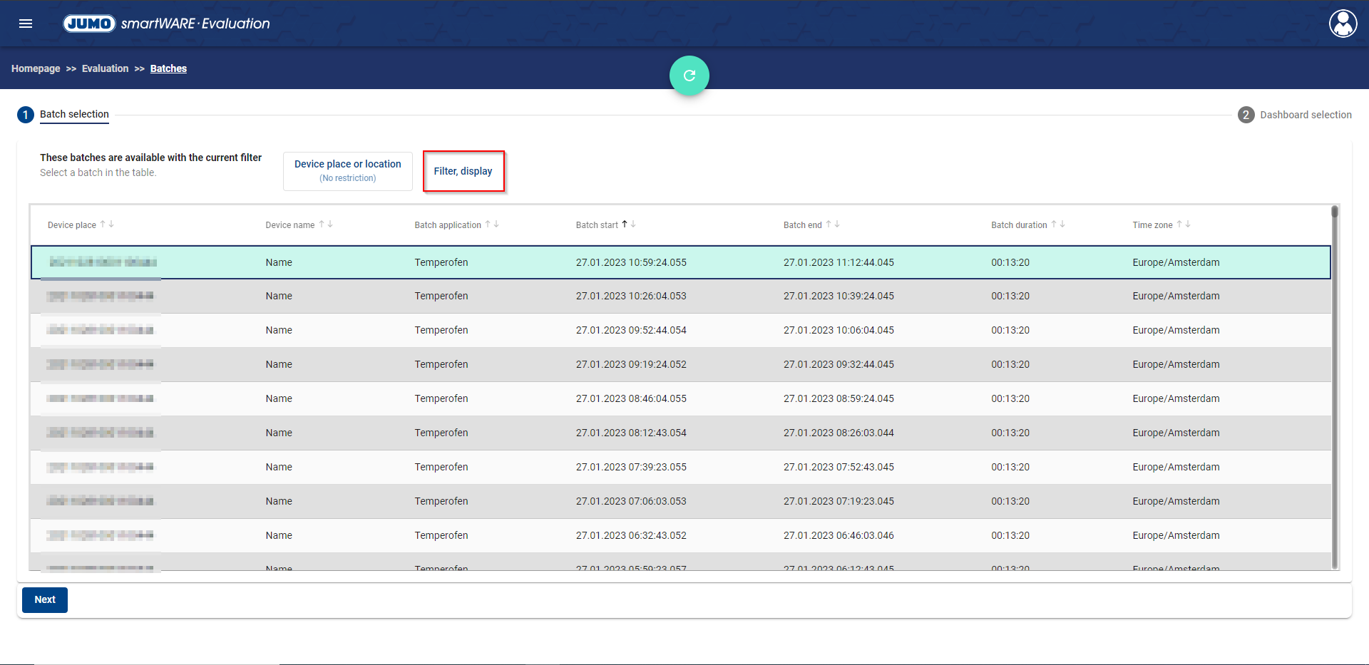 In the Batch selection step, the user is provided with a table showing batches that meet the filter criteria. The table contains all the columns that were previously defined as visible via the Display tab. A batch can be selected by left-clicking. The selection is confirmed by clicking the Next button.