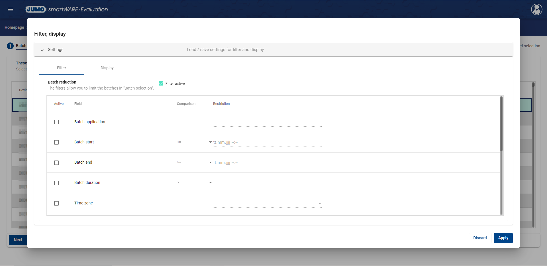 The batch selection can be limited by using filters and the data to be displayed for the batch can be set.