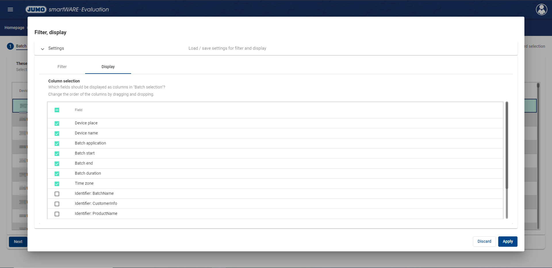 In the Display tab, the user can decide which fields to display as columns in the Batch Selection window. The order of the columns can also be changed using drag & drop.