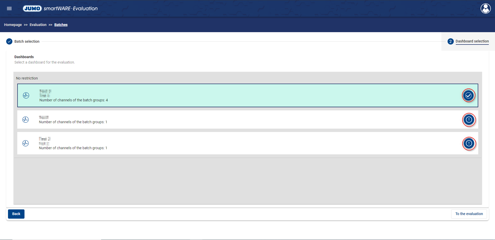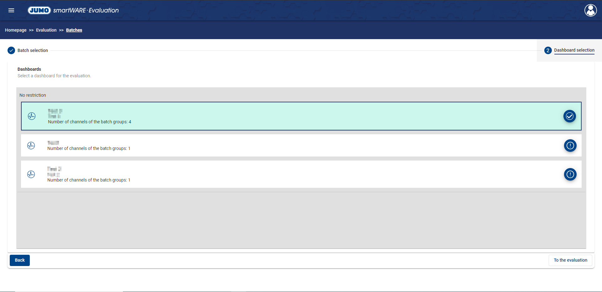 In this step, the Dashboard for the representation of the selected batch is selected. This screen contains three areas: