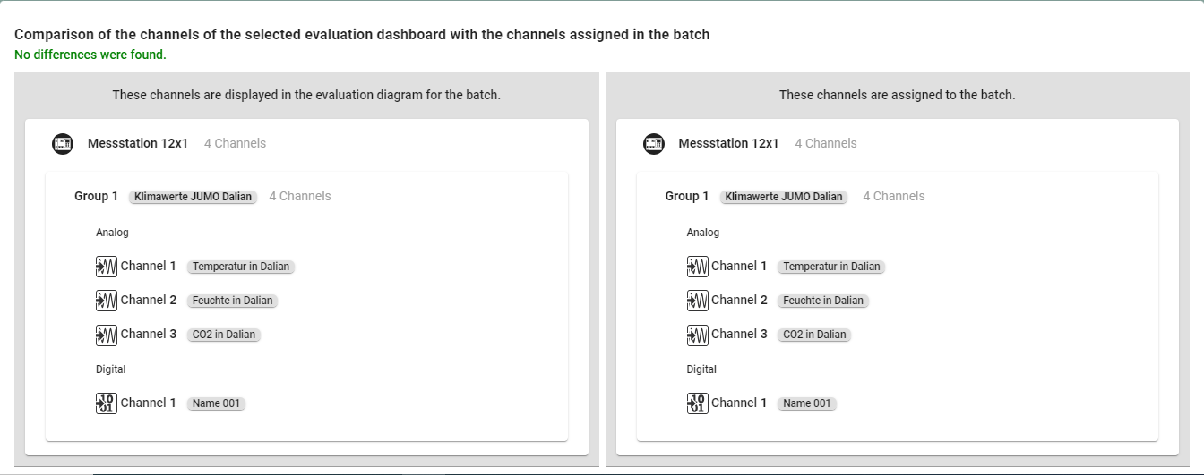 The check mark indicates that the channels displayed in the batch evaluation chart match the channels associated with the batch.