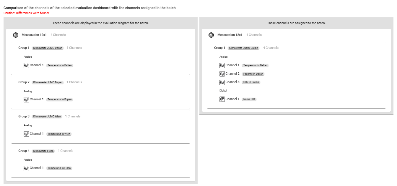 The exclamation point indicates that the channels displayed in the batch evaluation chart and the channels associated with the batch do not match. The groups and channels can be customized in the Dashboard Configuration.