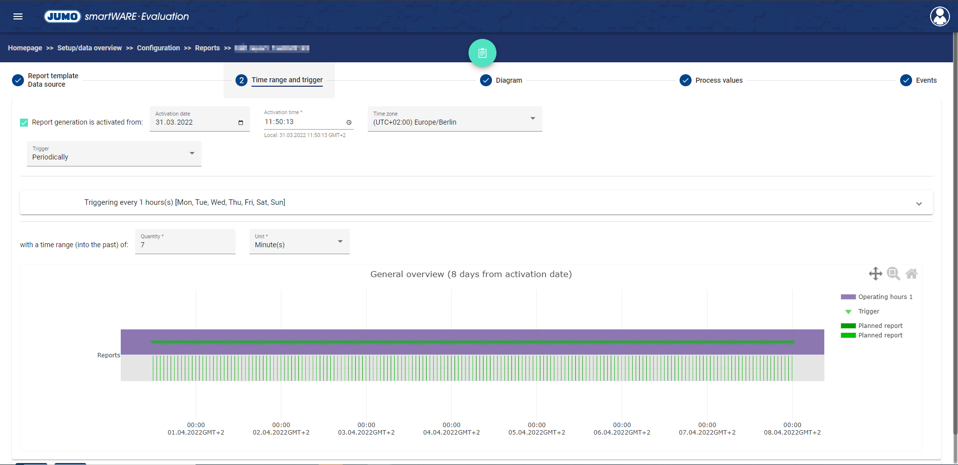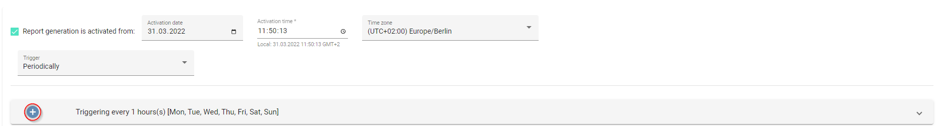 Periodic | Here you can define periods and intervals in which the reports are triggered. This applies within the defined operating times. | |