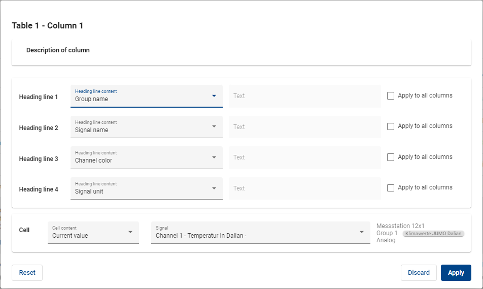 The columns per table can be individually designed. As you move your mouse over a column, the options for the selected column appear. A new column can be inserted next to the selected one, and the selected column can be deleted or changed.