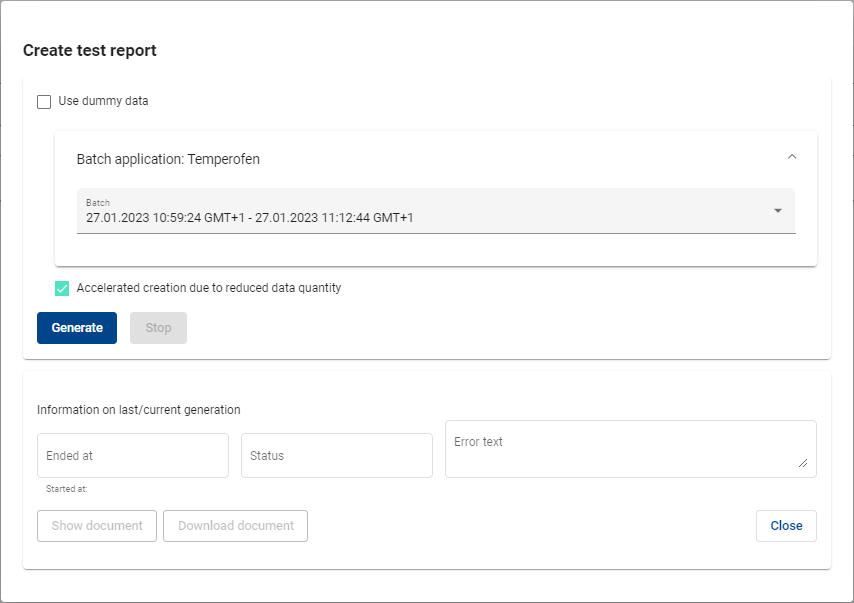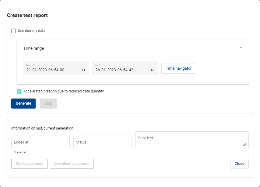 By clicking on the checkbox use test data, the test data stored in the system is used to generate the test report.