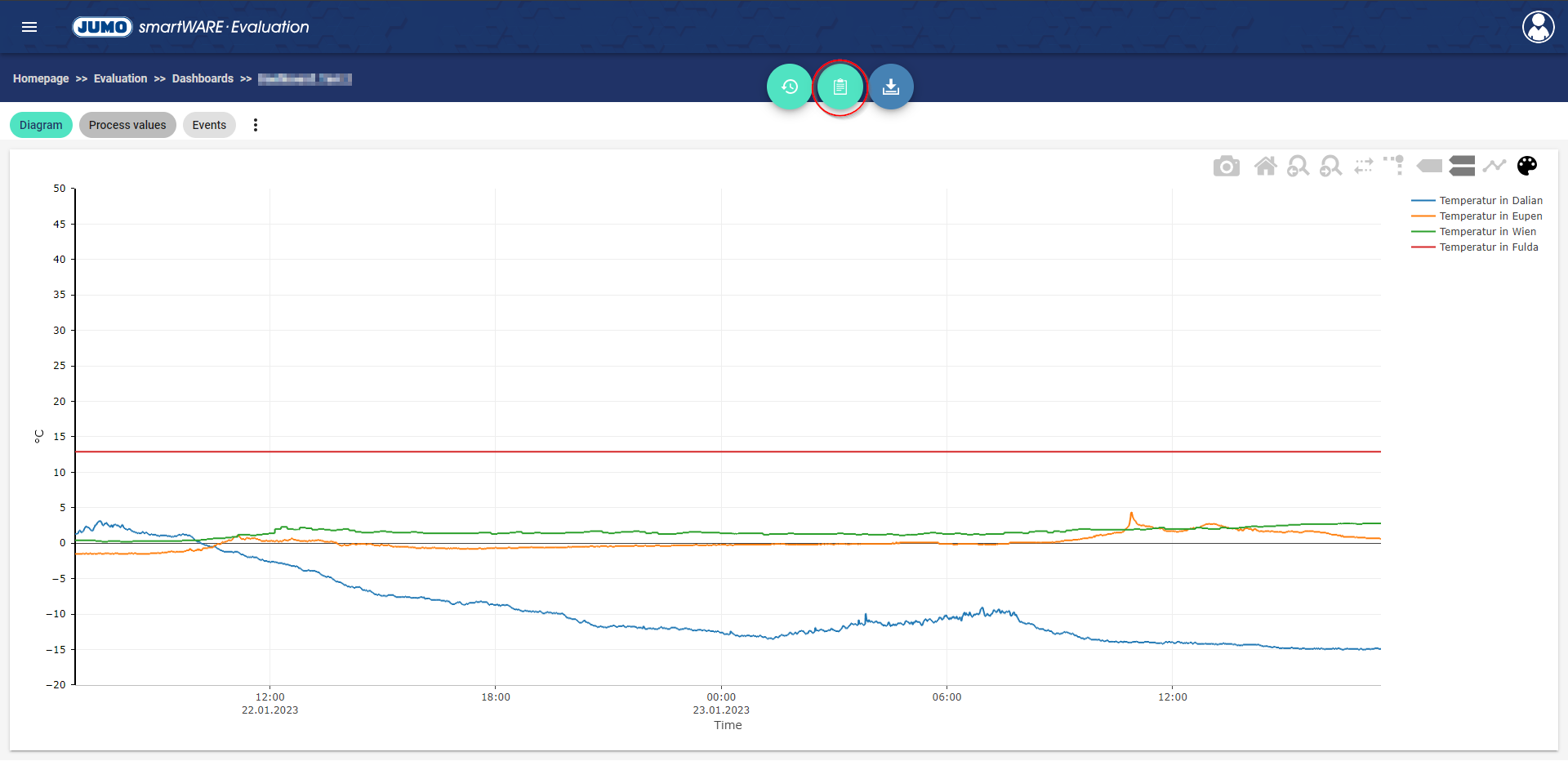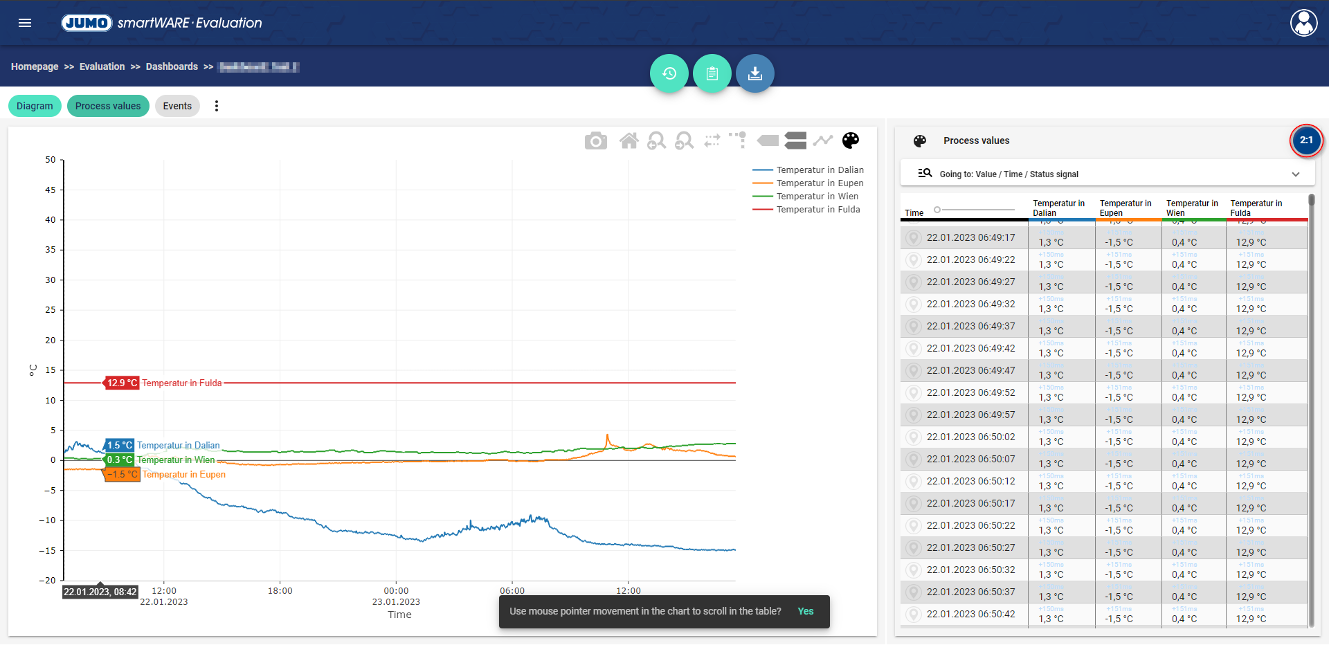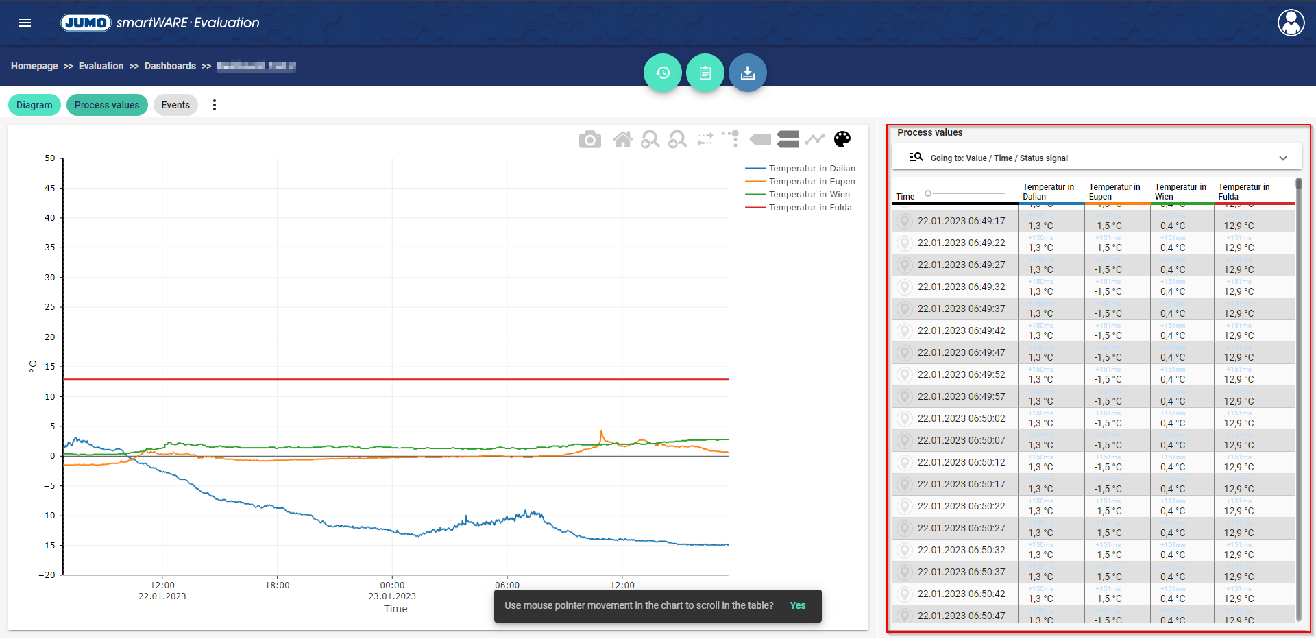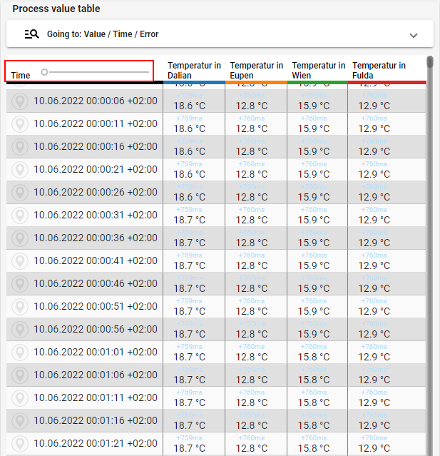 It is possible to set a marker in the chart for individual values. Left-clicking on a table row activates the marker for this value. Using the slider in the Process Value Table, it is possible to jump from one marker to another.