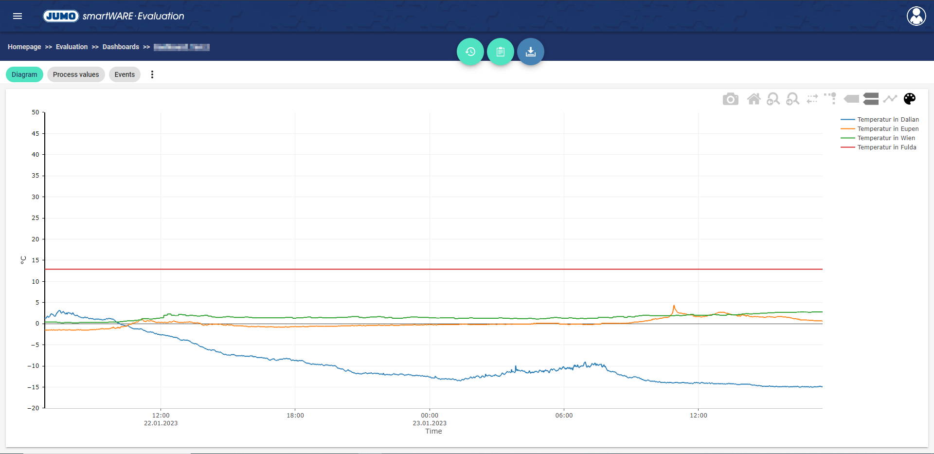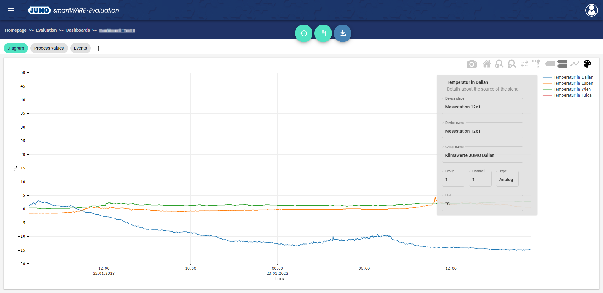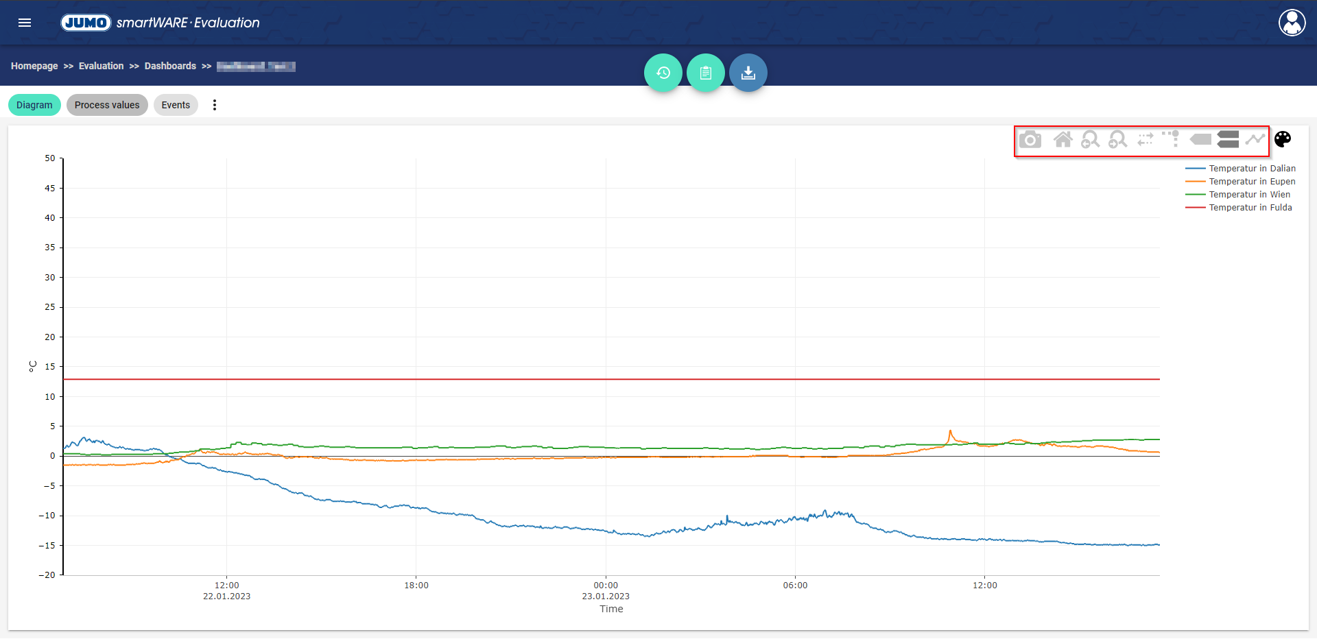 It is possible to set a marker in the chart for individual values. Left-clicking on a table row activates the marker for this value. Using the slider in the Process Value Table, it is possible to jump from one marker to another.