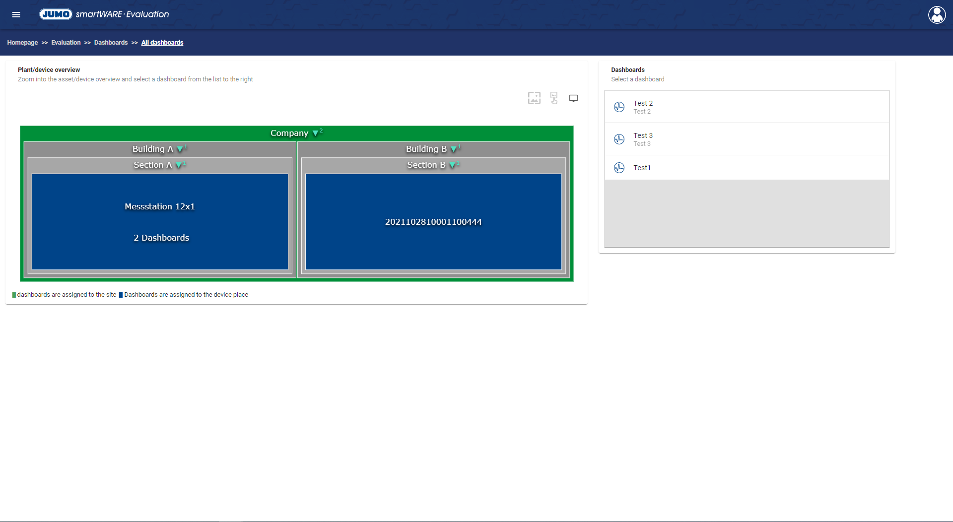 The list on the right half of the screen shows all Dashboards that are within or below the selected site/device location.