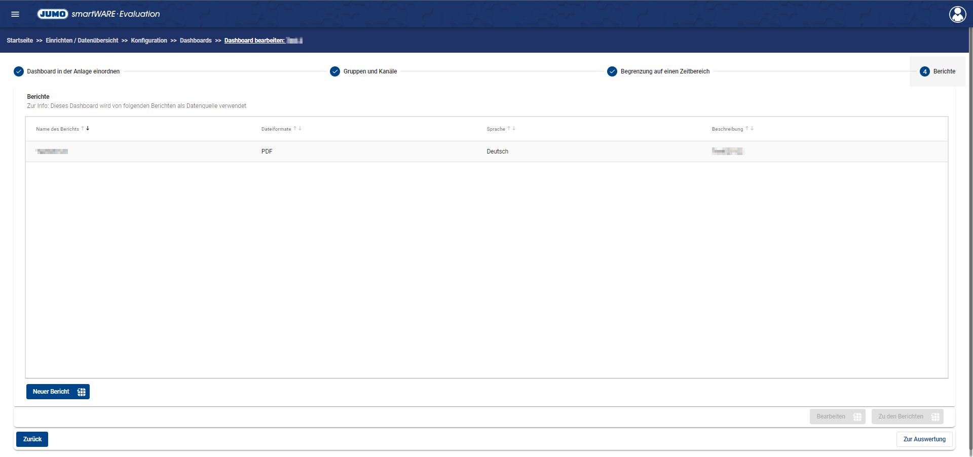 To edit an existing Dashboard, one of the existing Dashboards must be selected. The dashboard can be edited in four steps.