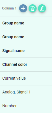 The columns per table can be individually designed. As you move your mouse over a column, the options for the selected column appear. A new column can be inserted next to the selected one, and the selected column can be deleted or changed.