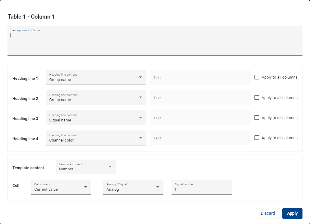 This window allows you to define the various columns. A description for the column can be added at the top of the window.