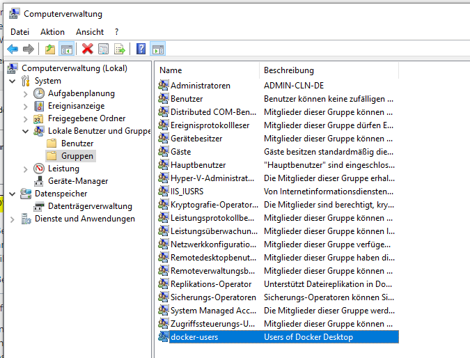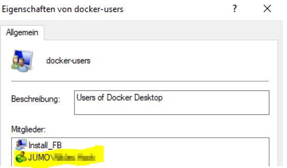 In this example, the Docker installation could only be performed by the administrator Install_FB. To run Docker with the normal user, it was necessary to add the user JUMO\User later.
