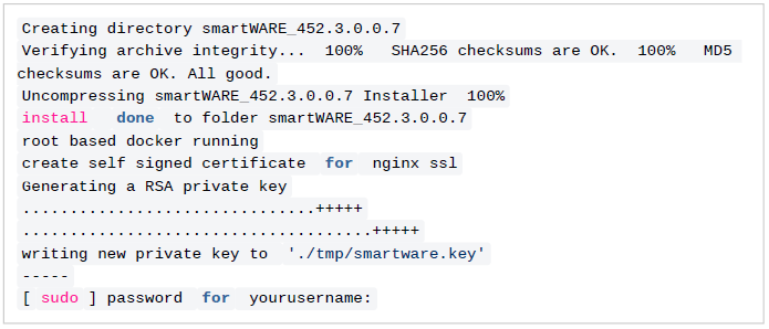 Since root (sudo) privileges are required for the installation, you will be asked for the password. Enter the password to start the installation. The required files are unpacked to the /tmp directory and then copied to the target directory ~/smartWARE_452.5.0.0.14. (Note: "~/" is the short form of the user's home directory "/home/user")