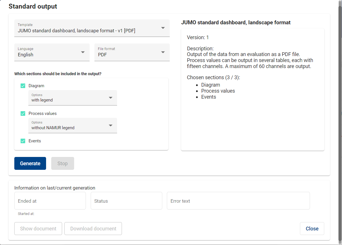 After the output template has been selected, further user specifications are required. These differ, depending on the which version has been selected. A standard output can, however, contain several process value tables.