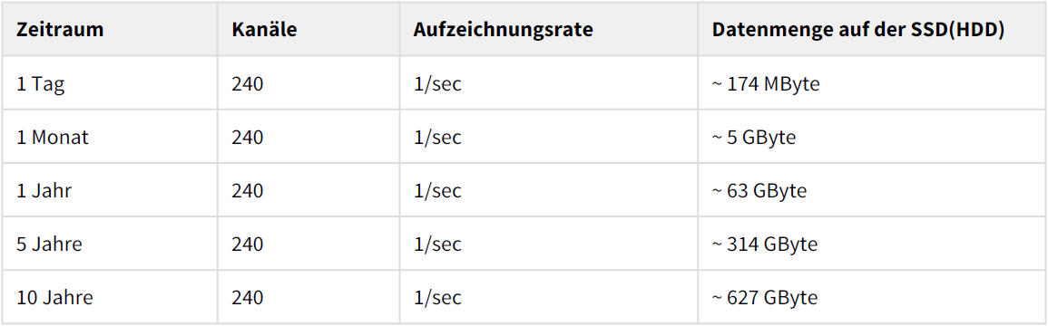 Amount of data [MByte] = number of channels * number of days * 0.725MB * recording rate (in number per second)