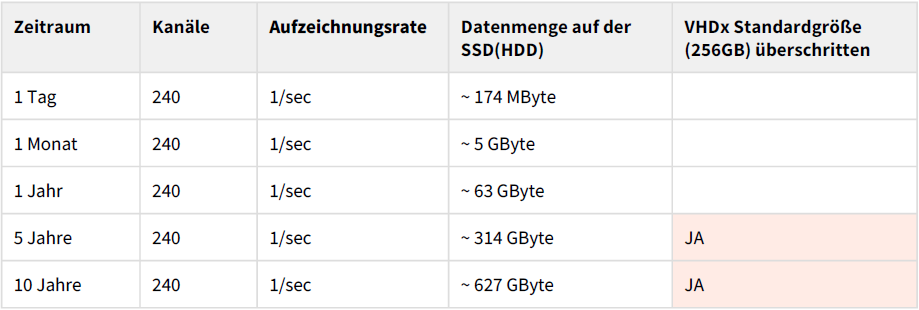 Amount of data [MByte] = number of channels * number of days * 0.725MB * recording rate (in number per second)