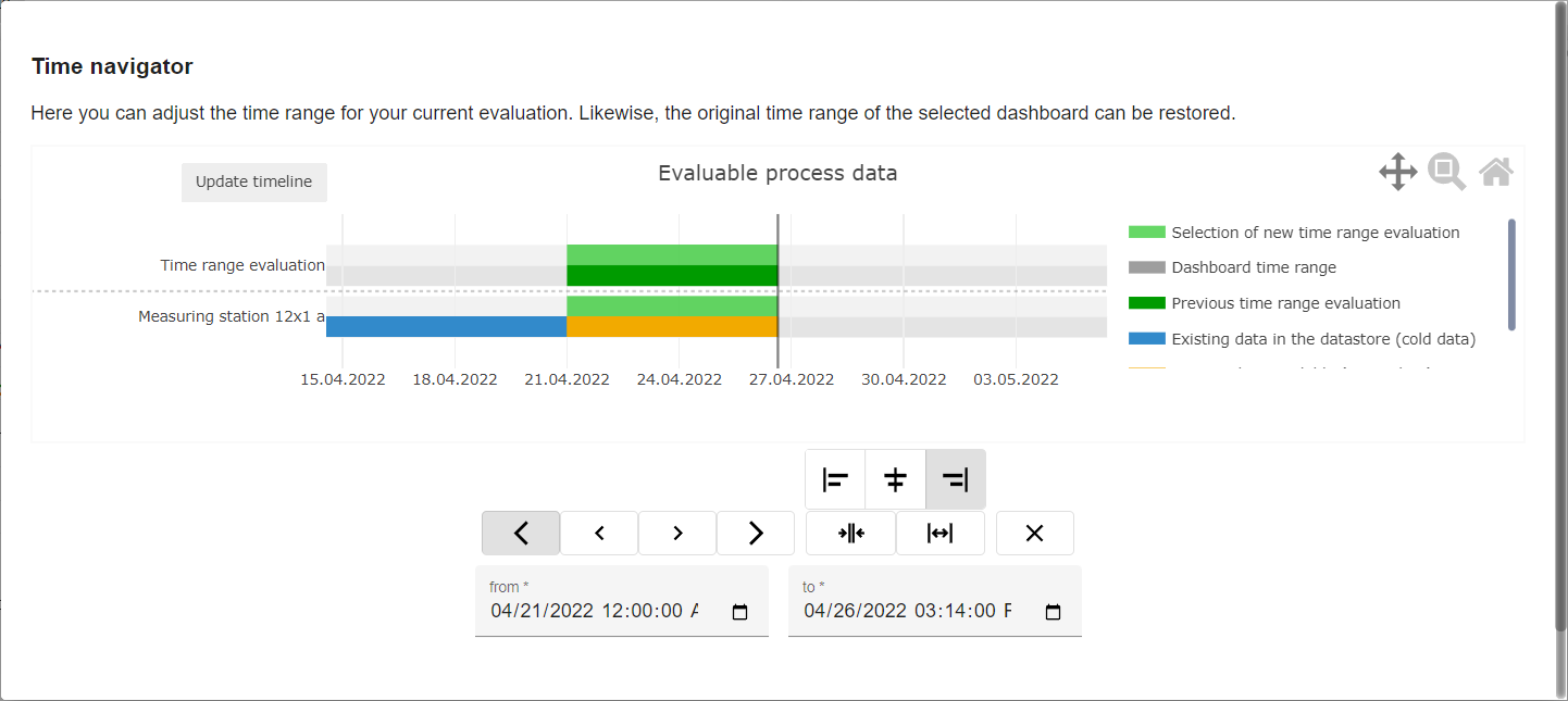 The time navigator allows the user to adjust the selected time range within the evaluation. Not only Warm Data can be accessed, but data that is only available as Cold Data can also be selected. Clicking "Apply time range" converts this data to Warm Data and displays it in the evaluation.