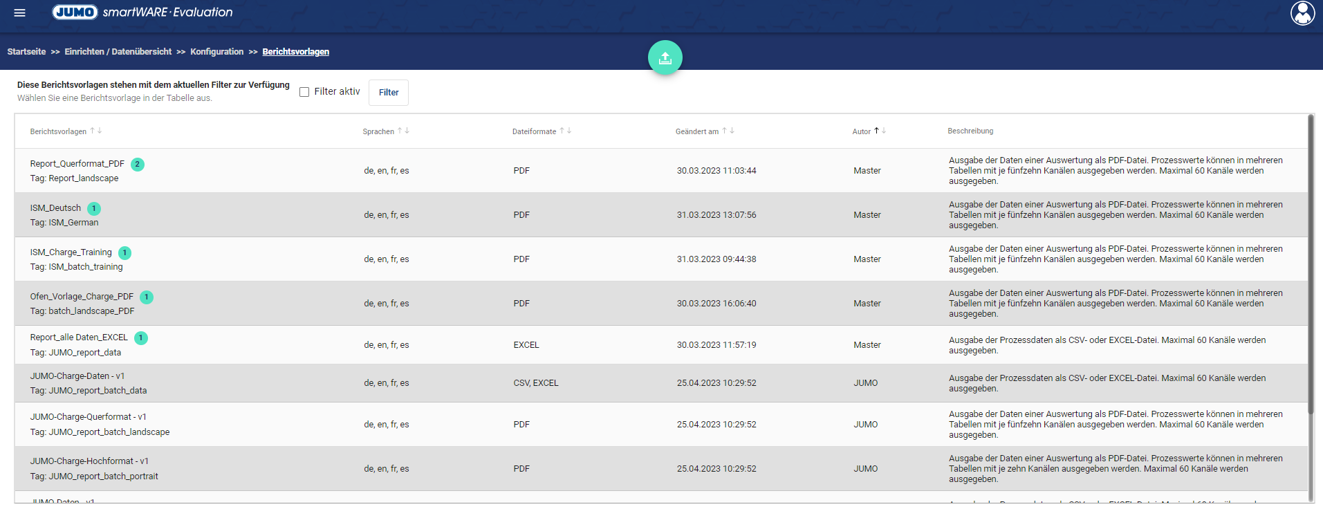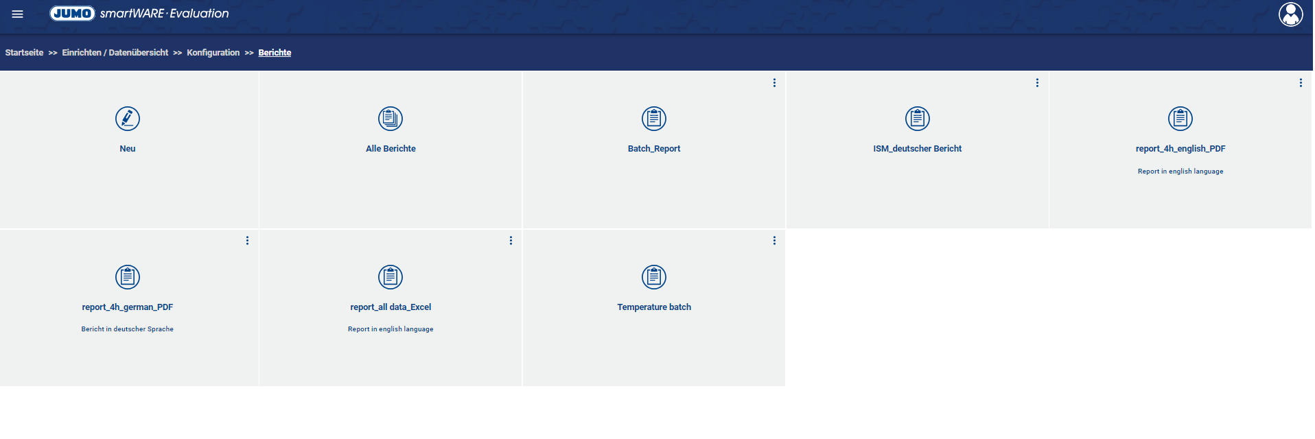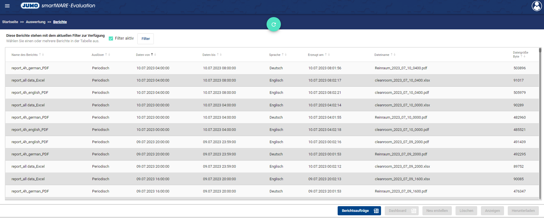 The report function has been integrated into JUMO smartWARE Evaluation. The user can view all automatically generated reports in the section "Evaluation > Reports".